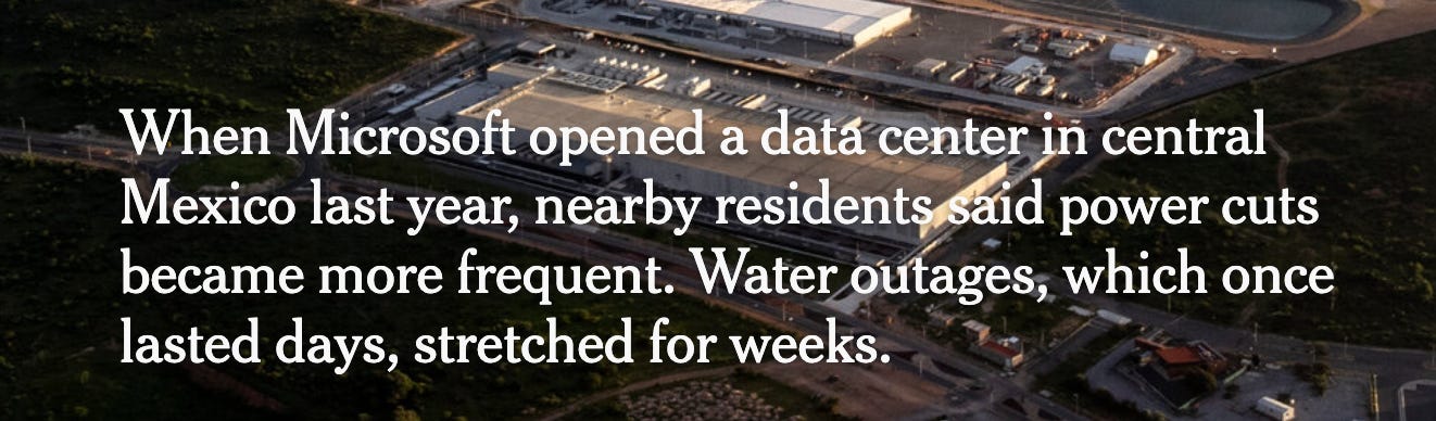 The New York Times ran a piece about a data center in Mexico causing regional water shortages. The article featured photos of residents suffering from lack of water.
