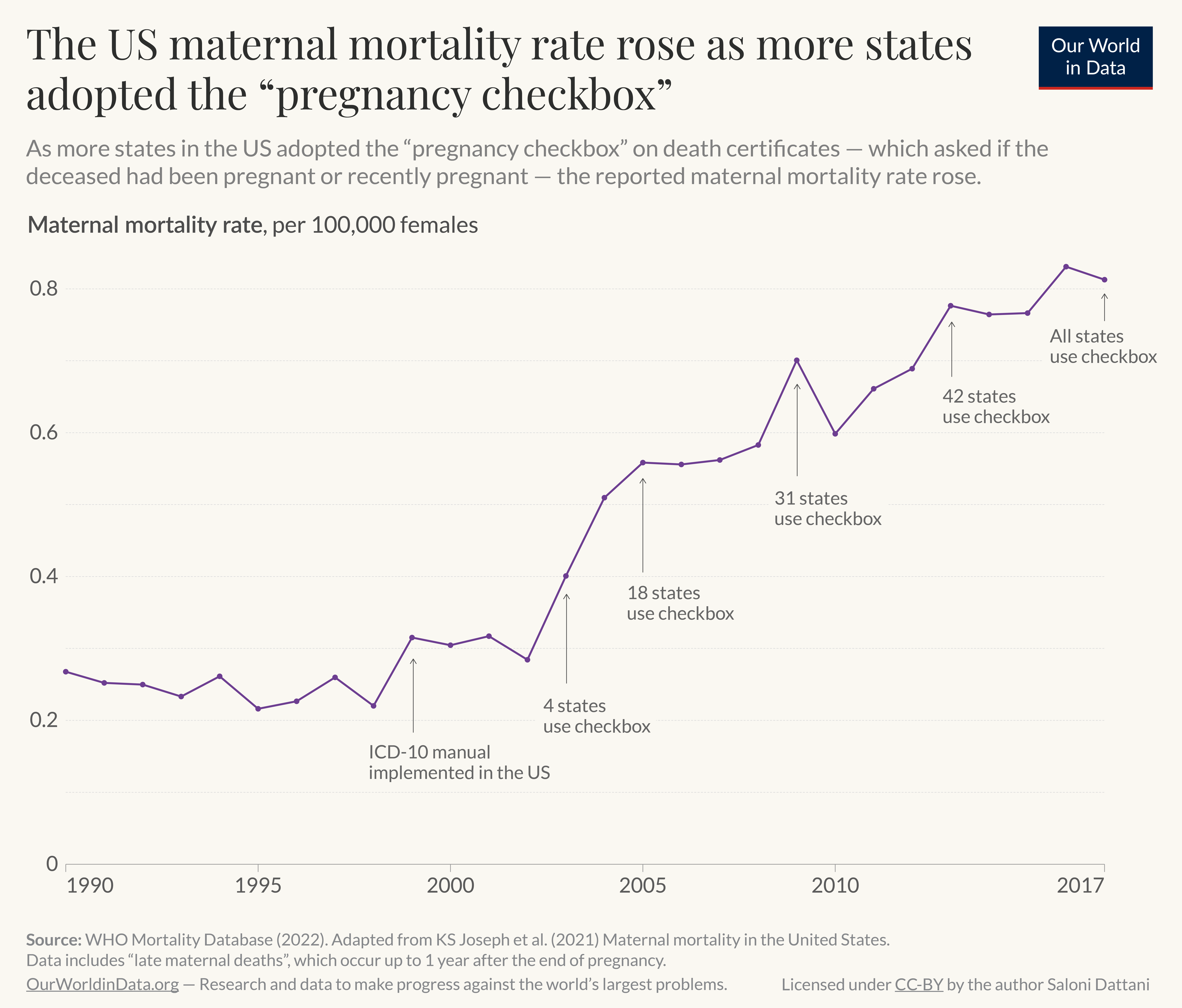 For years, I read that maternal mortality rates were skyrocketing in the US. Scientific American, NPR1, PBS, and Mother Jones reported deaths had more than doubled in the last 20 years.