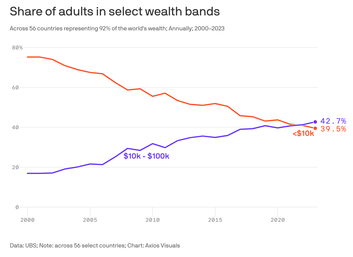 For the first time, less than 40% of adults worldwide have a net worth under $10,000, down from 75% in 2000. Now, more people have over $10,000 than under (thanks, Axios and FixTheNews).